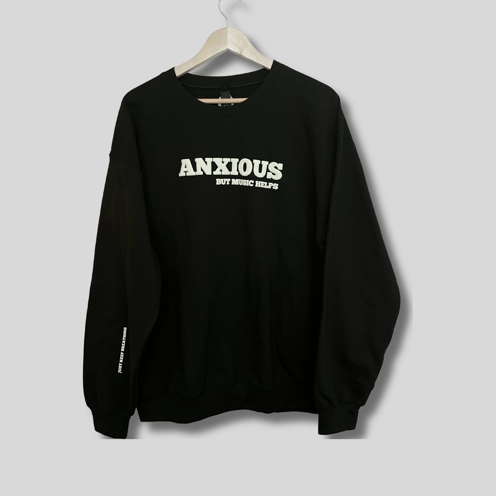 Stay calm and cozy in our Anxious, But Music Helps Crewneck. Made with a unique puff texture, this sweatshirt adds a touch of playfulness to your wardrobe. Plus, it's perfect for those who use music as a way to destress. (Calmness not guaranteed. But hey, at least you'll look cool.)